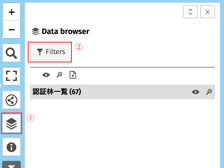 左側のレイヤーアイコン(①)をクリックし、「Filters」(②)を押すと検索フィルターが表示されます。以下の条件で絞り込み検索が可能です。