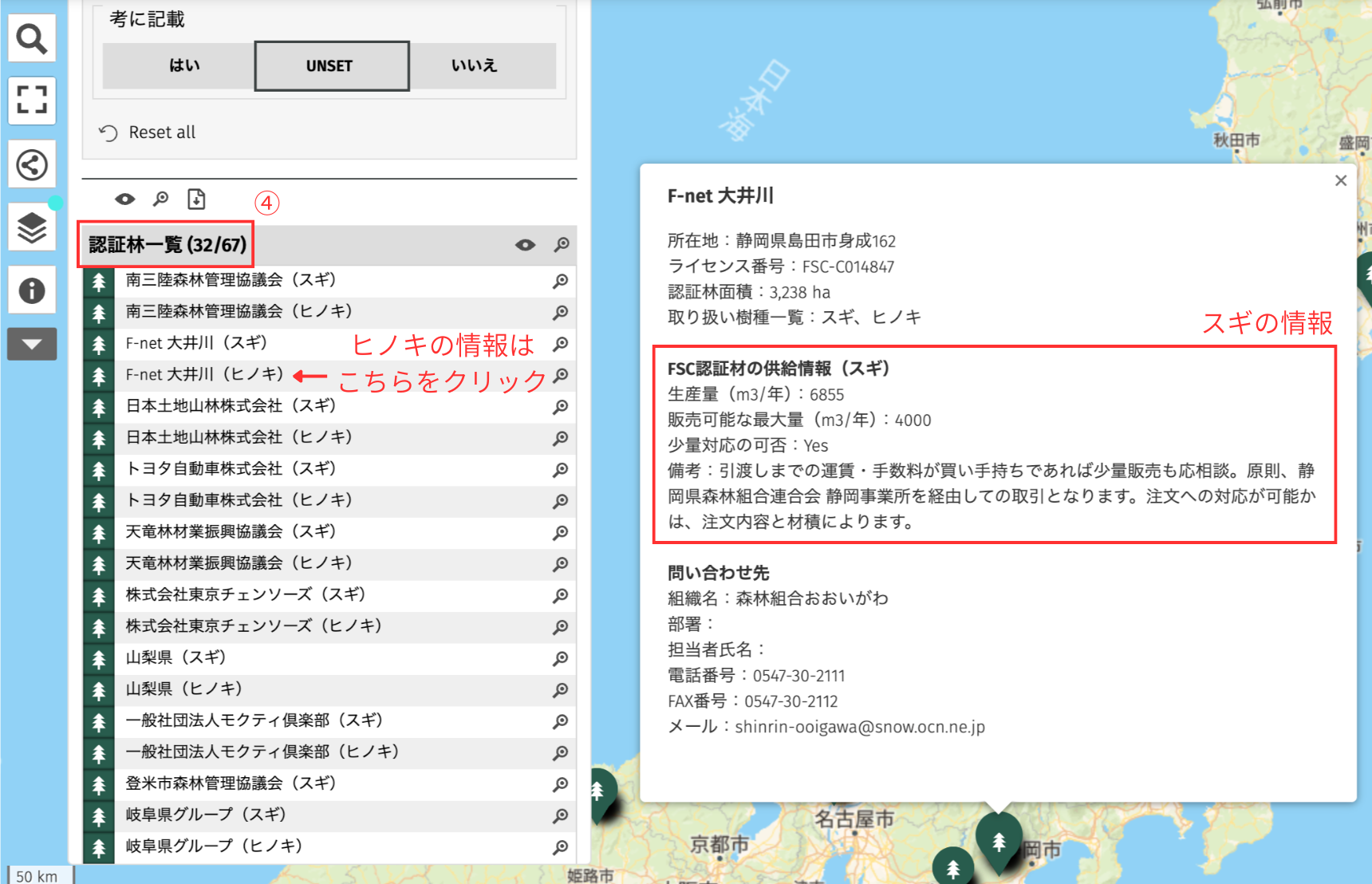 他の樹種の情報を確認する場合は、左側の「認証林一覧」(④)をクリックし、一覧から該当の樹種名が付いた認証林名を選択してください。選択した樹種の情報がポップアップに表示されます。