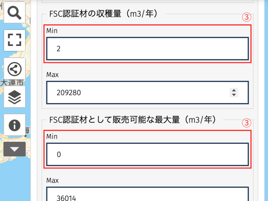 「FSC認証材の収穫量」および「販売可能な最大量」のフィルターでは、Min(③)に入力した数値以上の認証林が表示されます。