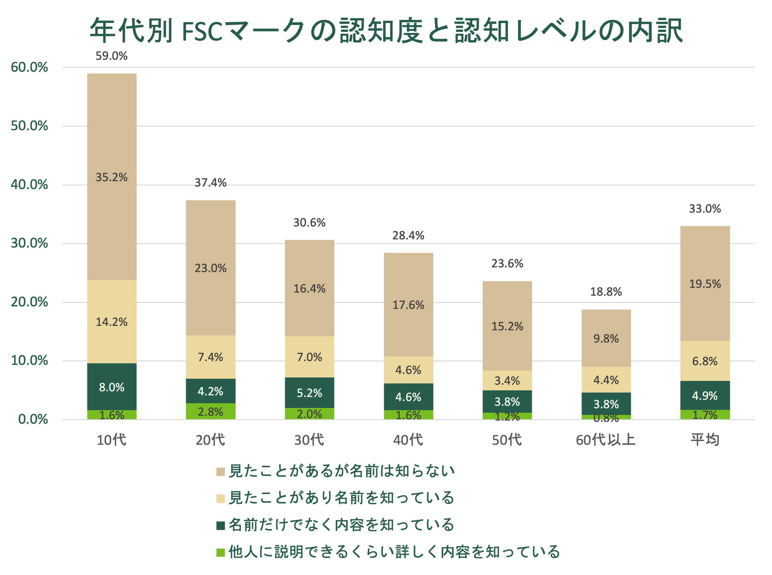 FSCマーク付き商品を購入する人の割合は、「他人に説明できるくらい詳しく知っている」が最も高く、次いで「名前だけでなく内容を知っている」、「見たことがあり名前を知っている」、「見たことがあるが名前は知らない」の順に低下し、内容に対する理解度が購買行動に影響することが示唆されました。