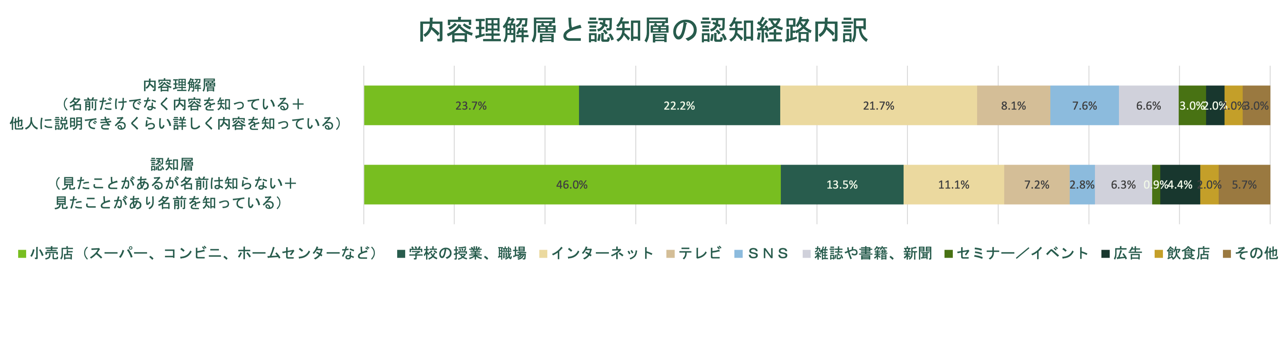 認知層では「小売店」が46%を占める一方、内容理解層では、「小売店」に並び「学校の授業、職場」「インターネット」が同程度の割合を占めており、経路の違いが理解度に影響していることが示唆されました。
