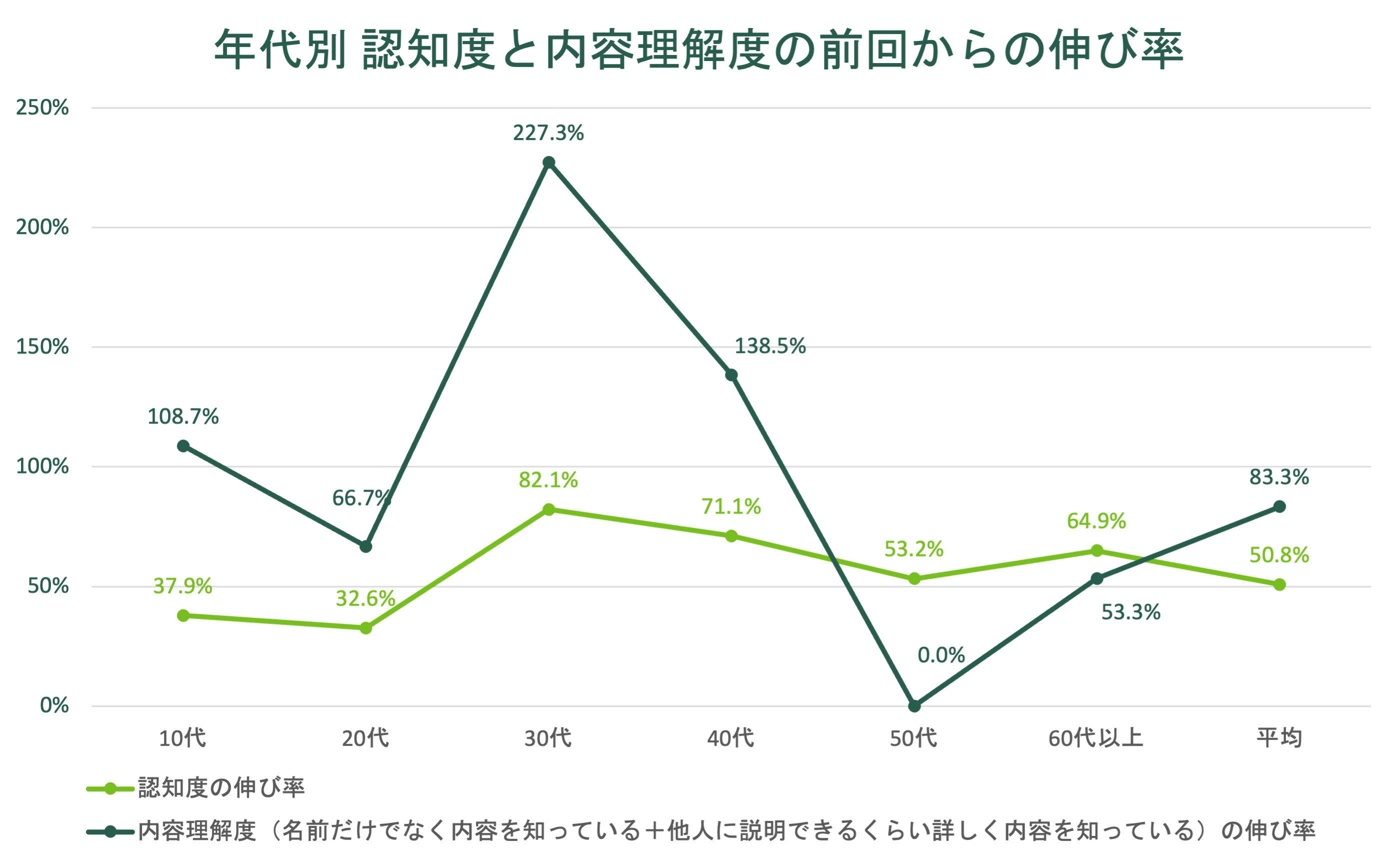 また、10代は認知度の伸び率は平均以下ですが、内容理解度の伸び率は30代・40代に次いで高い結果となりました。