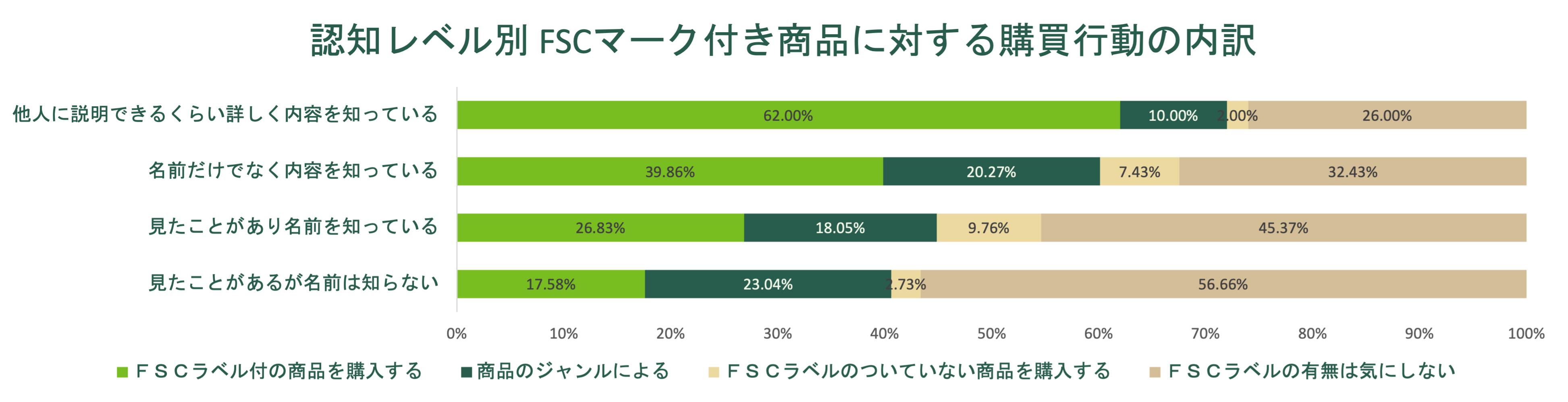 FSCマーク付き商品を購入する人の割合は、「他人に説明できるくらい詳しく知っている」が最も高く、次いで「名前だけでなく内容を知っている」、「見たことがあり名前を知っている」、「見たことがあるが名前は知らない」の順に低下し、内容に対する理解度が購買行動に影響することが示唆されました。