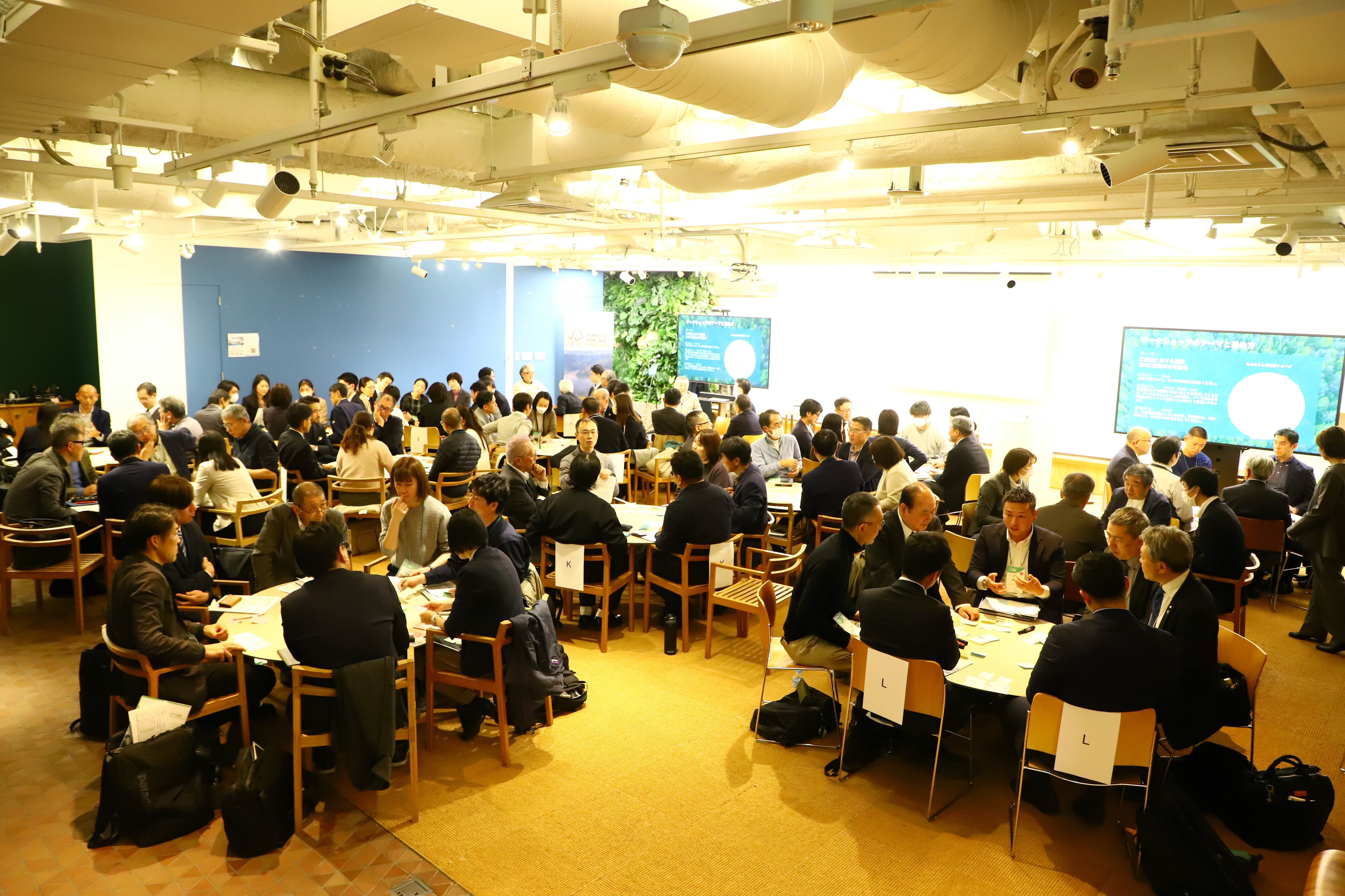 最後に、参加者の皆様に15のグループに分かれていただき、ワークショップを実施しました。このワークショップでは、流通における課題と、FSC認証材の可能性の2つをテーマに、川上に位置するFSC認証林から川下の需要側まで、業種を超えたメンバーで議論いただき、課題解決の糸口を探っていただきました。