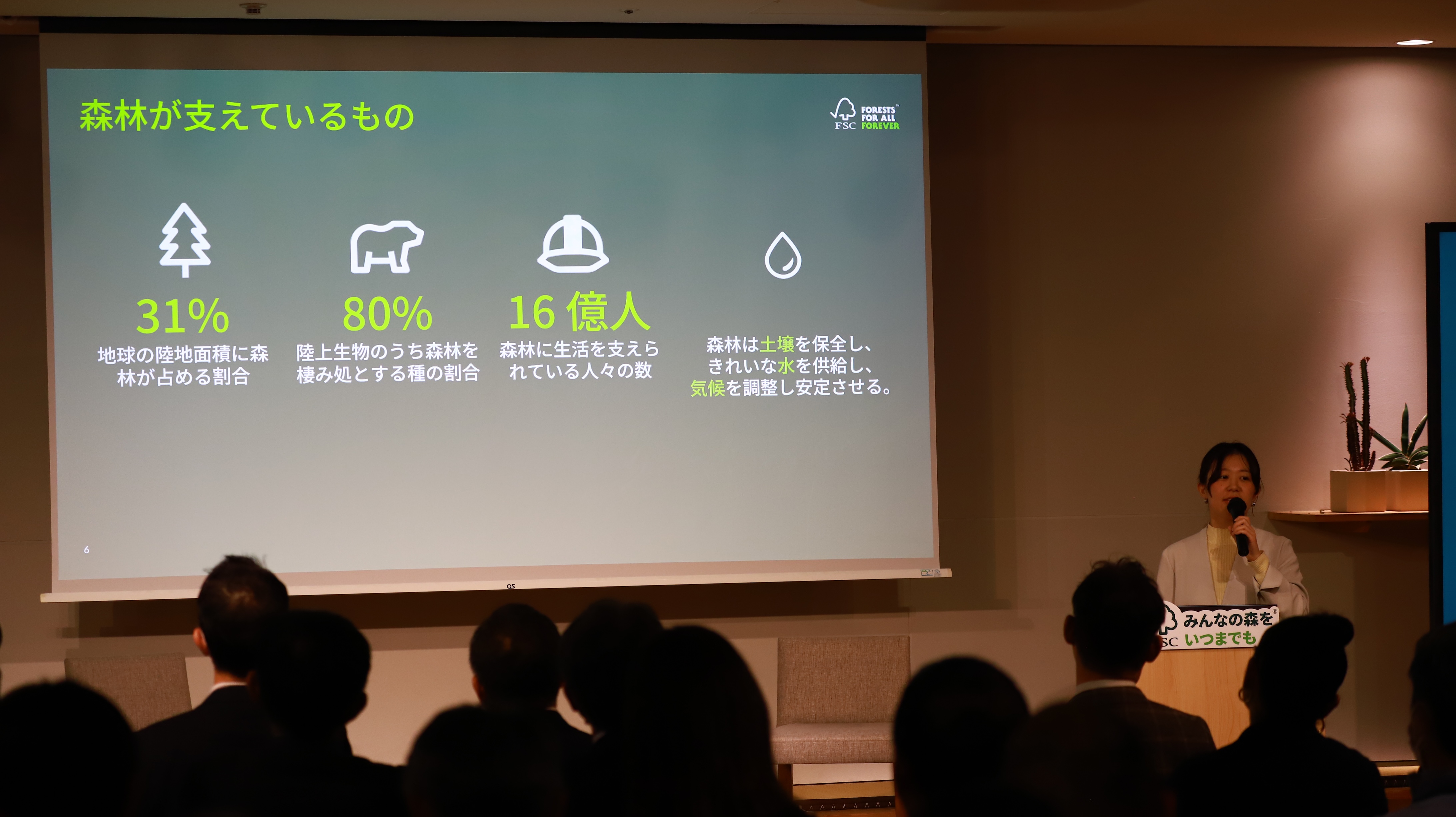 初めにFSCジャパン 河野より、FSC認証およびプロジェクト認証の概要、本イベント開催の背景や今後FSCジャパンで予定している取組についてご紹介いたしました。