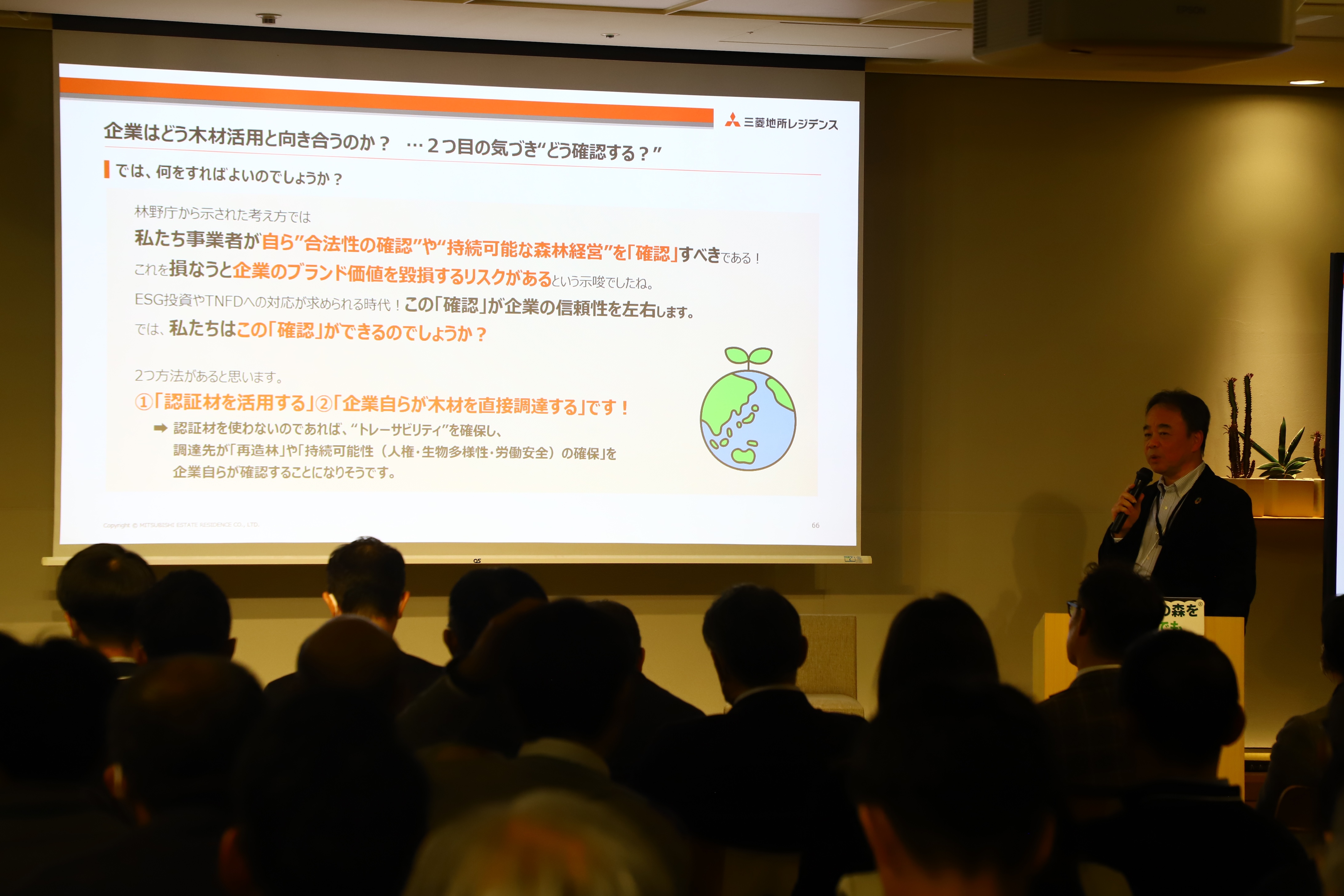三菱地所レジデンスでは、情報開示への対応が求められる中で、木材調達が企業価値やブランドに直結する重要なテーマになっていることを背景に、持続可能な調達のあり方を検討してきました。海外を含むサプライチェーン全体を自社で確認することには限界があるとの認識から、再造林や人権、生物多様性に配慮し、トレーサビリティが担保された木材のみを使用する方針を明確化し、FSC認証材やプロジェクト認証を活用。特にリスクが高いとされる型枠合板から取組を始め、業界全体での改善につなげるため立ち上げた型枠合板の勉強会や、第三者認証を通じて調達リスクを低減し、木材の背景や価値を説明できる体制づくりを進めていることが紹介されました。