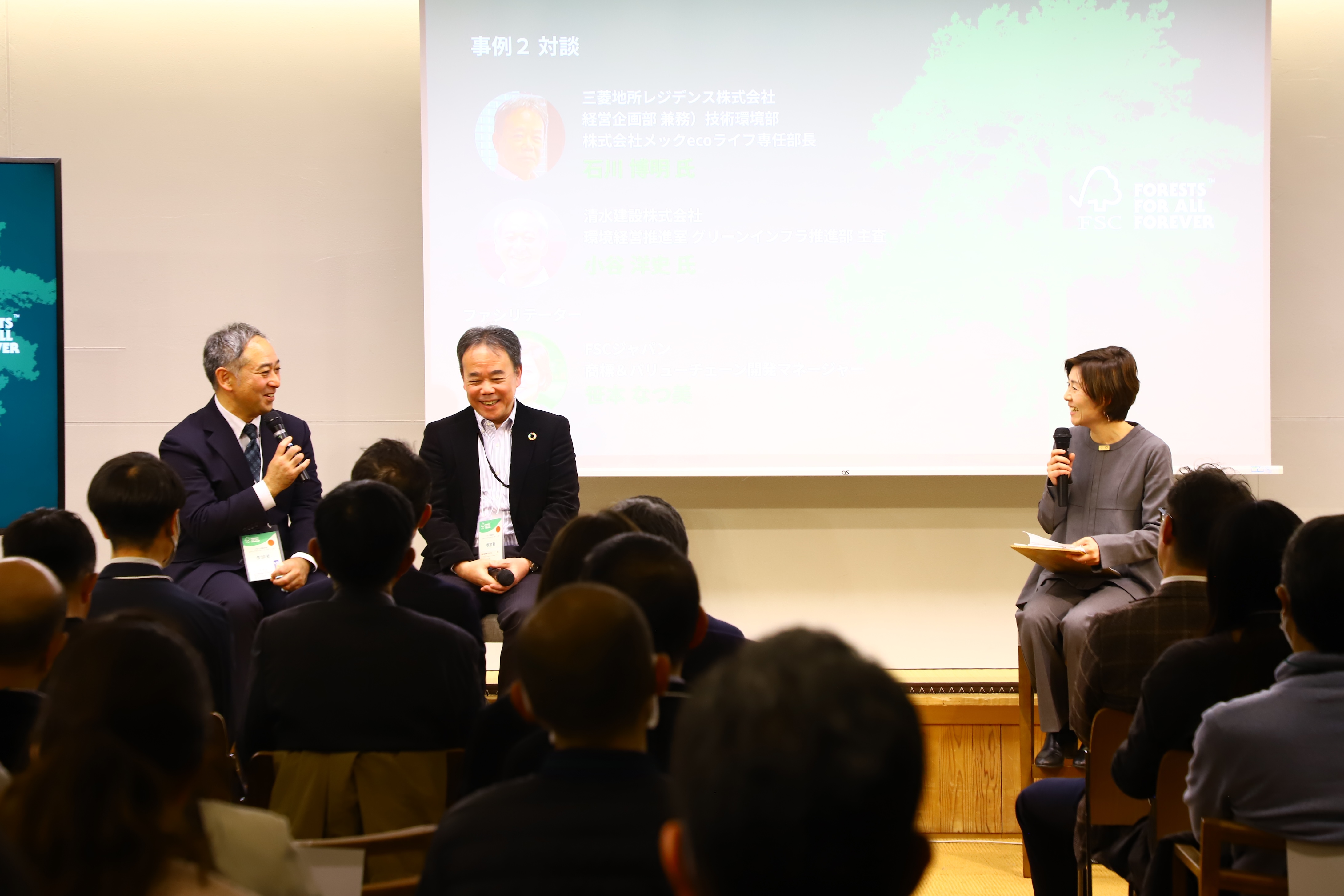 本イベントは、カーボンニュートラルやネイチャー・ポジティブの実現に向けて、森林資源の責任ある調達や持続可能な利用が一段と重要視される中、建築や内装分野におけるFSC認証木材の活用促進と流通課題の共有を目的として開催されたものです。