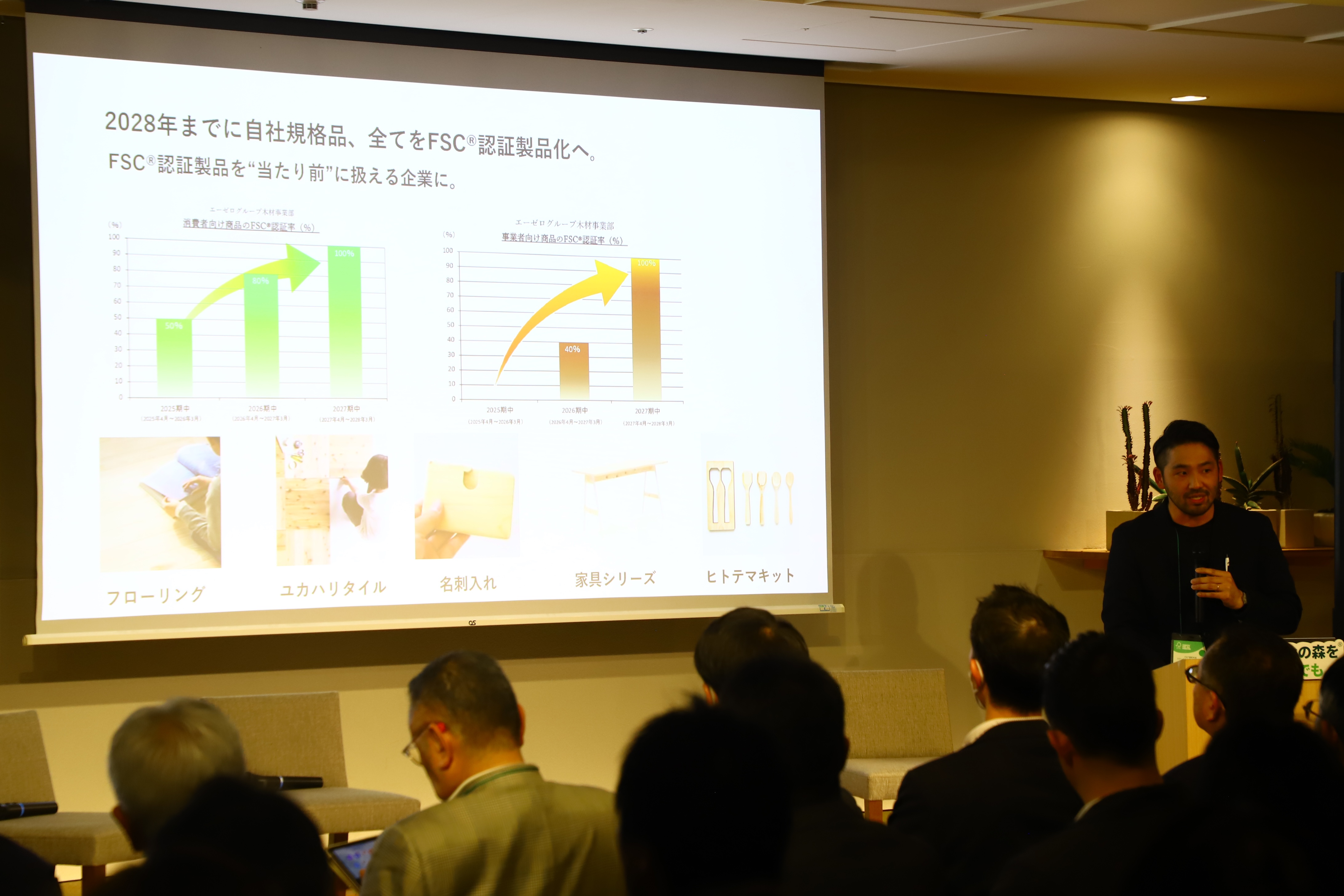 岡山県西粟倉村を拠点とするエーゼログループは、木材事業を起点に、FM認証を取得する西粟倉村の100年の森構想と共に進めてきた事業をご紹介いただきました。FSC認証取得から15年の経験を生かし、「スプーン1本から、ビル1棟まで」をテーマに、構造材・合板・内装材など幅広いFSC認証材の供給体制を整備。2028年までに自社製品の全面FSC認証化を目指す方針を発表しました。一方で、エンドユーザーへの価値伝達が課題であり、認証の意義をどう伝えるかが今後の重要なテーマとして共有されました。