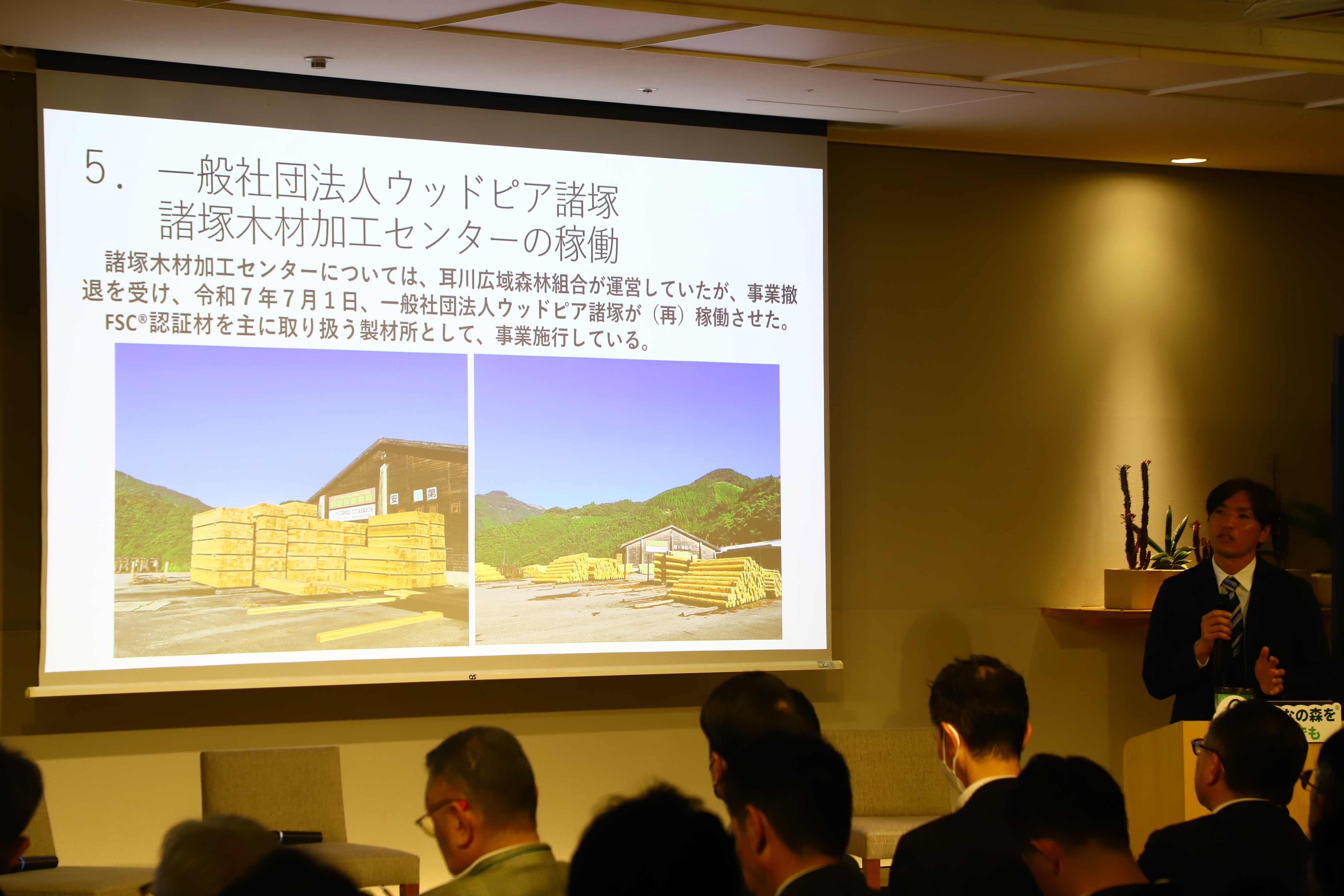 諸塚村は、村域の約9割を森林が占める地域として、早くからFSC森林認証とCoC認証に取り組んできました。小規模な森林所有者が多い中、グループ認証によって持続可能な森林管理を進めています。近年は、村内の認証製材所が一時休止する課題もありましたが、昨年第三セクター化により事業を再開。さらに「諸塚の木を諸塚で使う」仕組みづくりとして、認証材出荷への奨励制度を導入するなど、地域内循環とFSC材利用の定着を目指した取り組みが紹介されました。